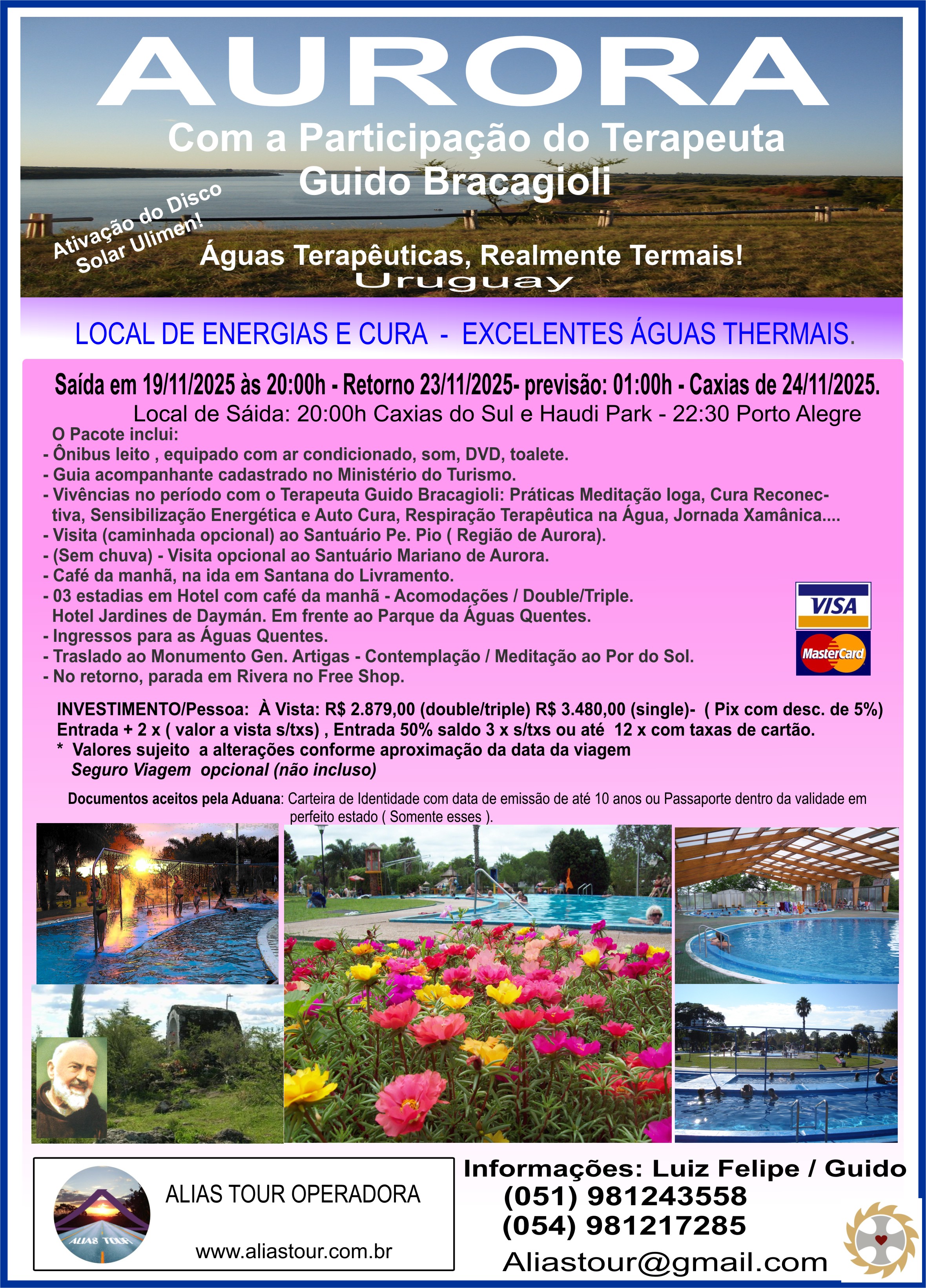 Com o Terapeuta Guido Bracagioli. Transporte Leito - 3 Noites de Hospedagem com café da manhã, Hotel em Frente ao Parque das Águas Quentes - Café da manhã na ida. - Entradas águas quentes - Traslados aos Locais visitados e Período para compras no Free Shop Rivera na Volta.